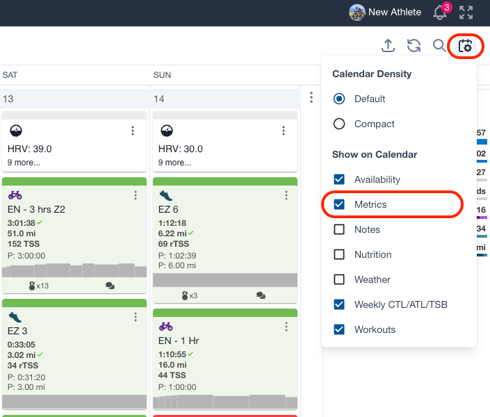 - If you cannot see your data on your TrainingPeaks calendar please ensure that you have ‘Metrics’ enabled in your Calendar Settings.
