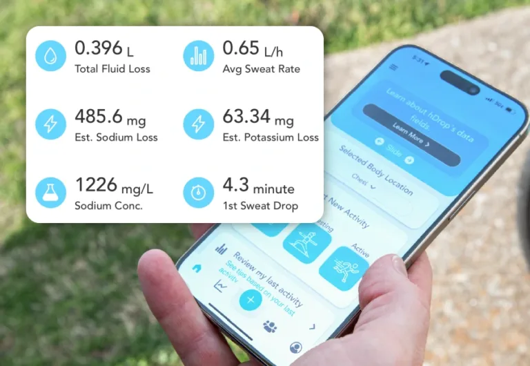 hDrop provides real-time sweat monitoring, delivering instant data on sweat loss, rate, and electrolyte levels.